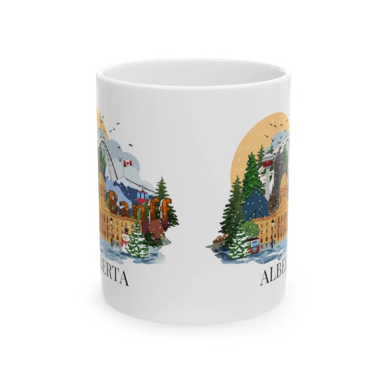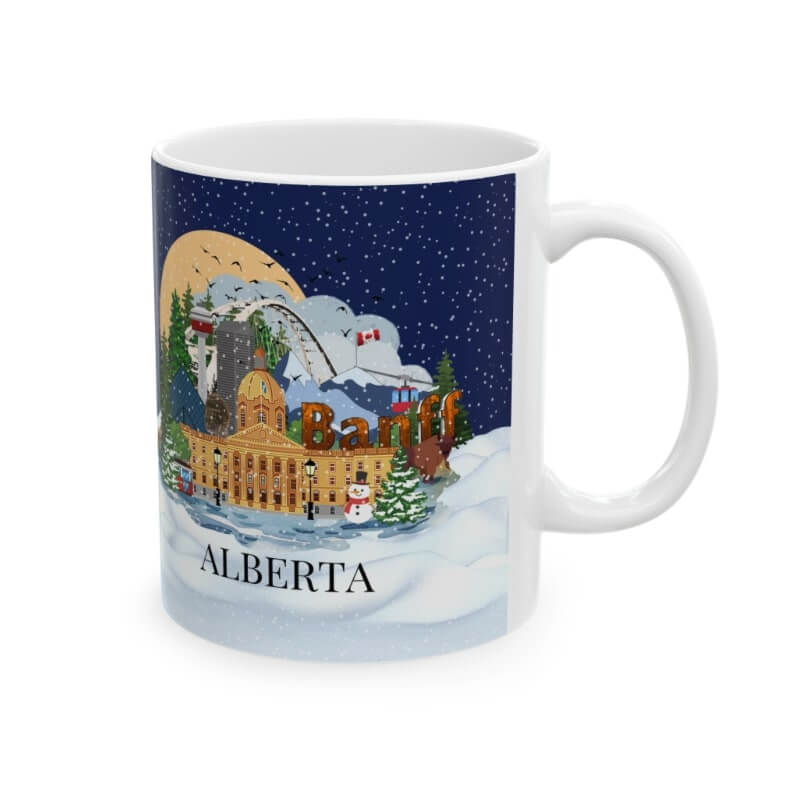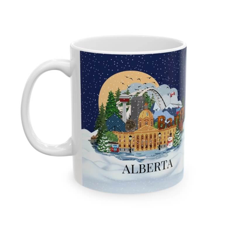 This Alberta Christmas themed mug is the perfect gift for yourself, your loved ones or for that coffee or tea lover in your life! This cute illustrated mug is decorated with all the major sites and places to visit in and around the province making it an awesome souvenir and just what you need to remember (or inspire) your travels by!