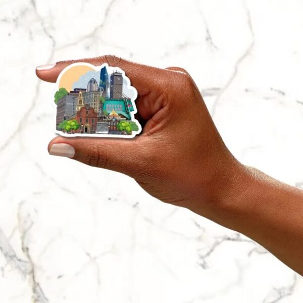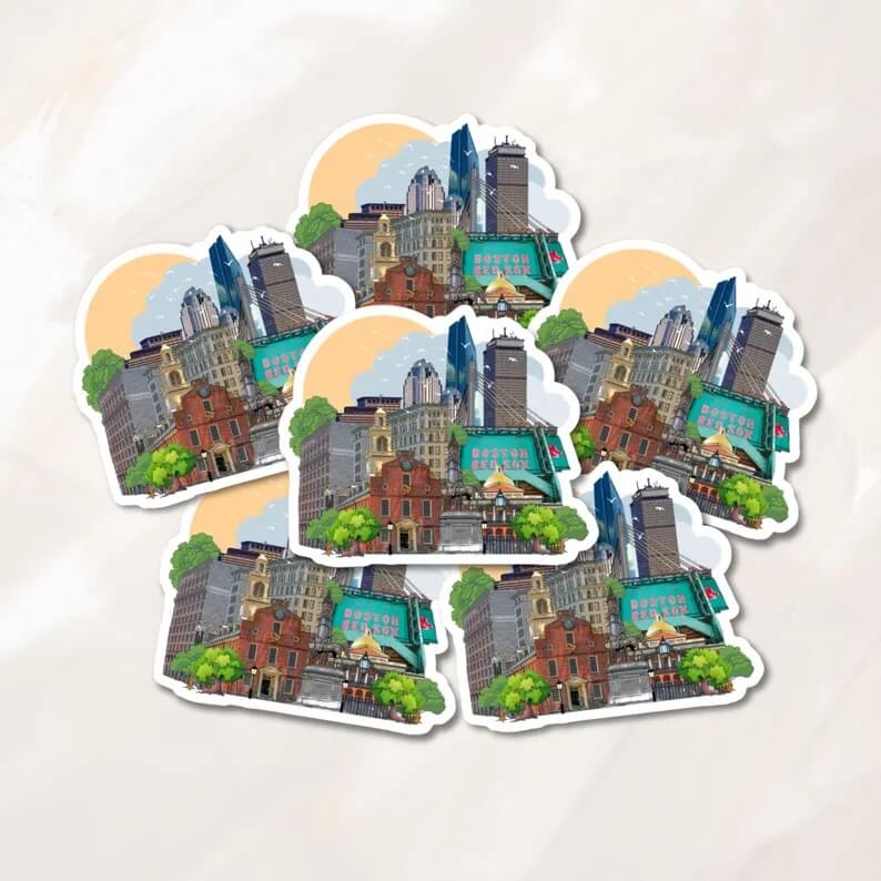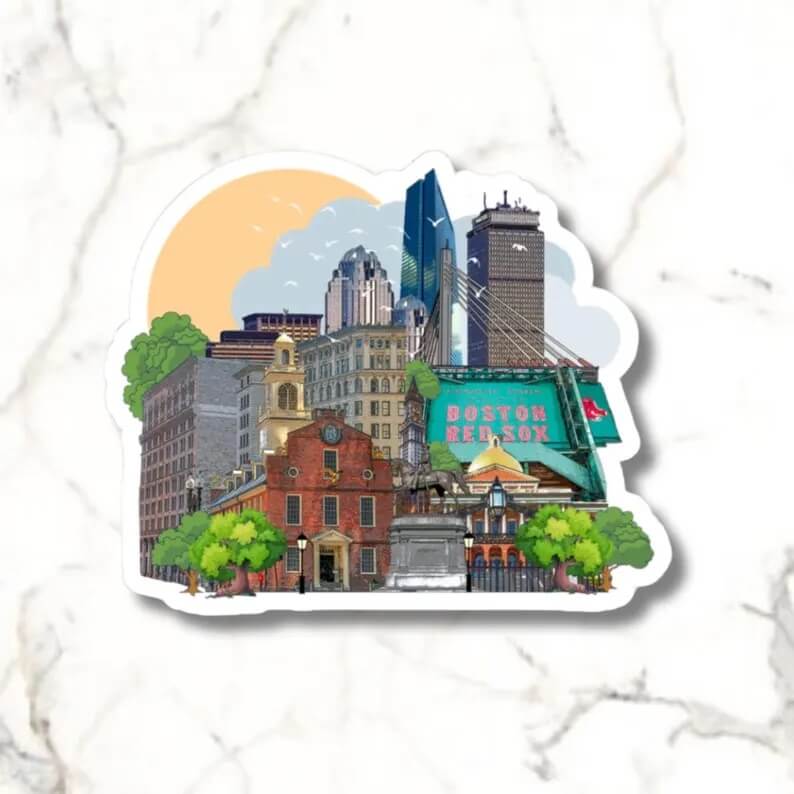 Boston blends history with city energy — historic buildings, recognizable stadium views, and architectural landmarks lining its streets. Created from original travel photography and illustrated into a detailed city scene, this sticker reflects the character and history that make Boston unforgettable.