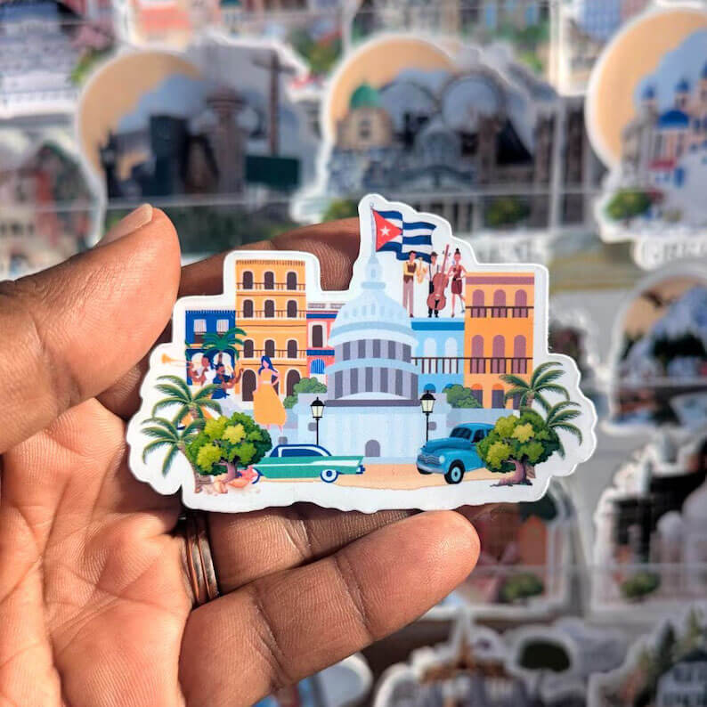 Cuba is colour, rhythm, and nostalgia. This design brings together vintage cars, vibrant architecture, palm trees, sandy shores, and the Cuban flag — reflecting the energy and warmth found throughout the island. Created from original travel photos and illustrated into a lively scene, this sticker carries a piece of Cuba’s culture wherever you place it.