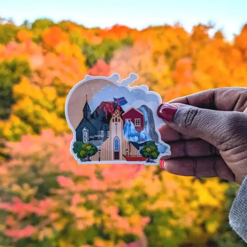 Iceland feels otherworldly — waterfalls crashing into moss-covered landscapes, black churches standing against open skies, volcanoes, icebergs, and the Blue Lagoon’s surreal blue waters. This design brings those unforgettable elements together into one illustrated scene, created from my original travel photography and transformed into a keepsake that reflects Iceland’s raw, dramatic beauty.