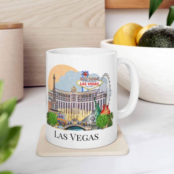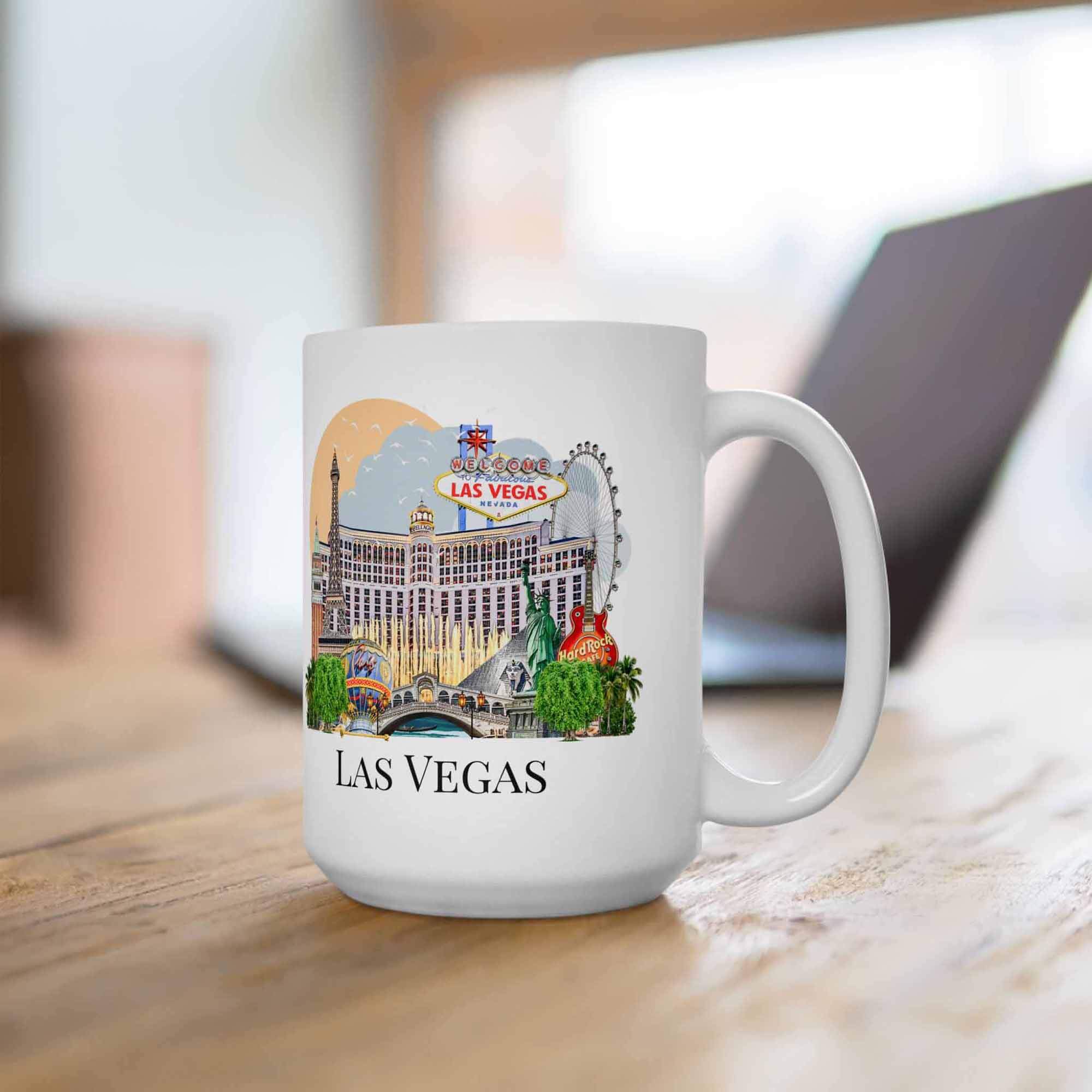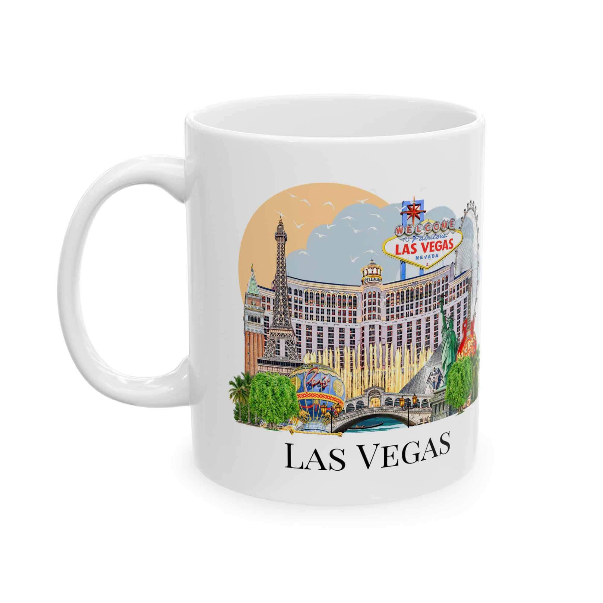 This Las Vegas Landmark Mug brings together the city’s most recognizable sights — the famous Welcome to Las Vegas sign, Bellagio fountains, Paris hotel tower, Luxor pyramids, the High Roller Ferris wheel, and the glowing skyline that makes Vegas unforgettable.