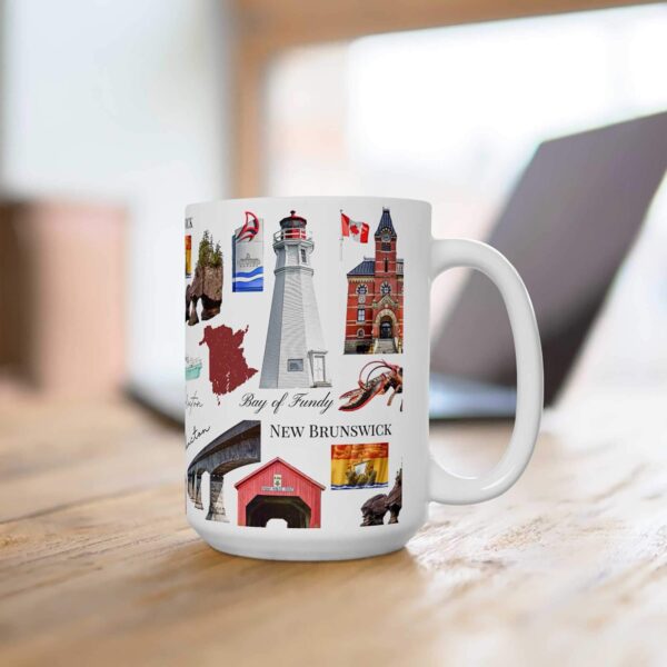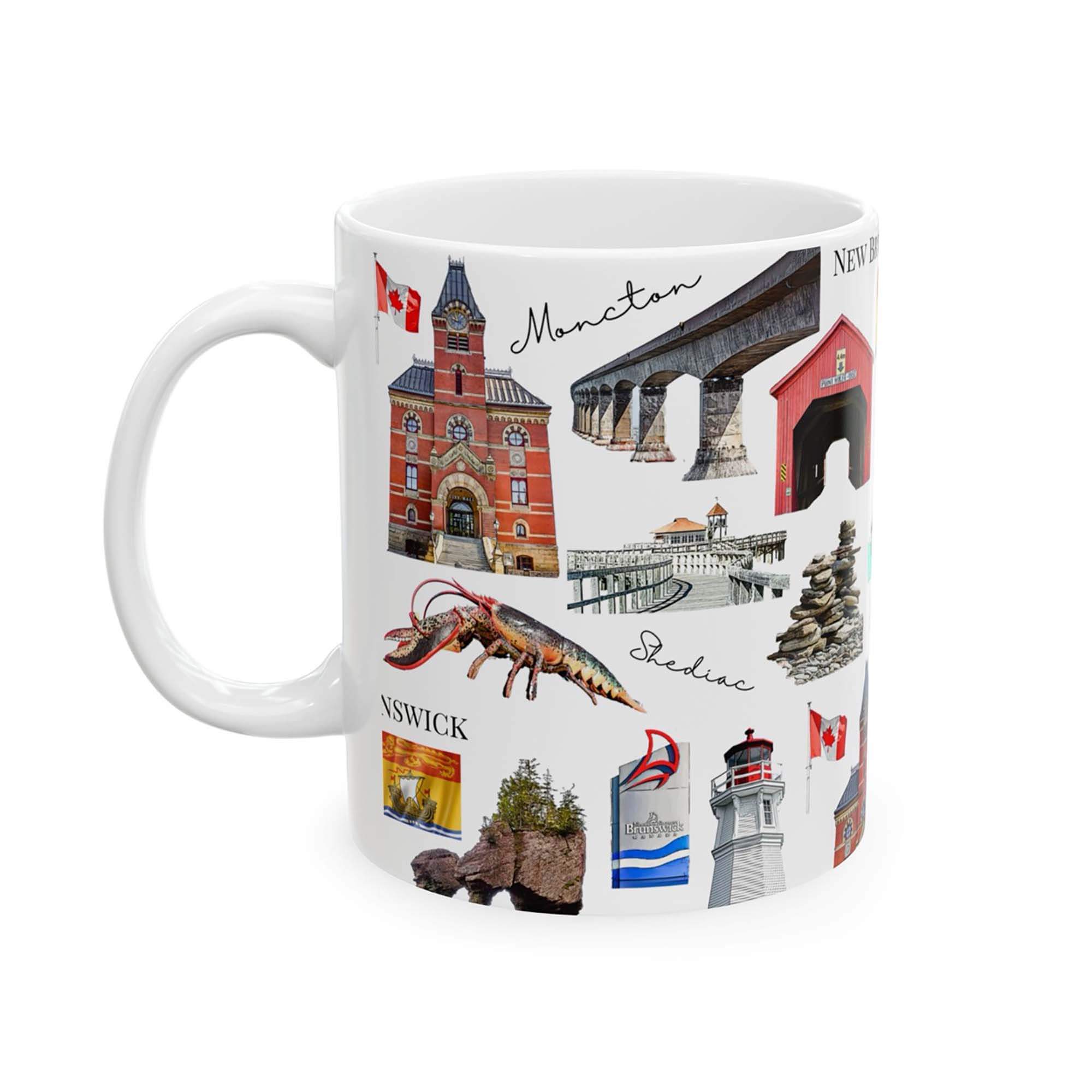 This New Brunswick Pattern Mug showcases a repeating design of the province’s most recognizable icons — Hopewell Rocks, Confederation Bridge, Cape Jourimain Lighthouse, Bouctouche boardwalk, fishing boats, lobster traps, and Fredericton City Hall.
