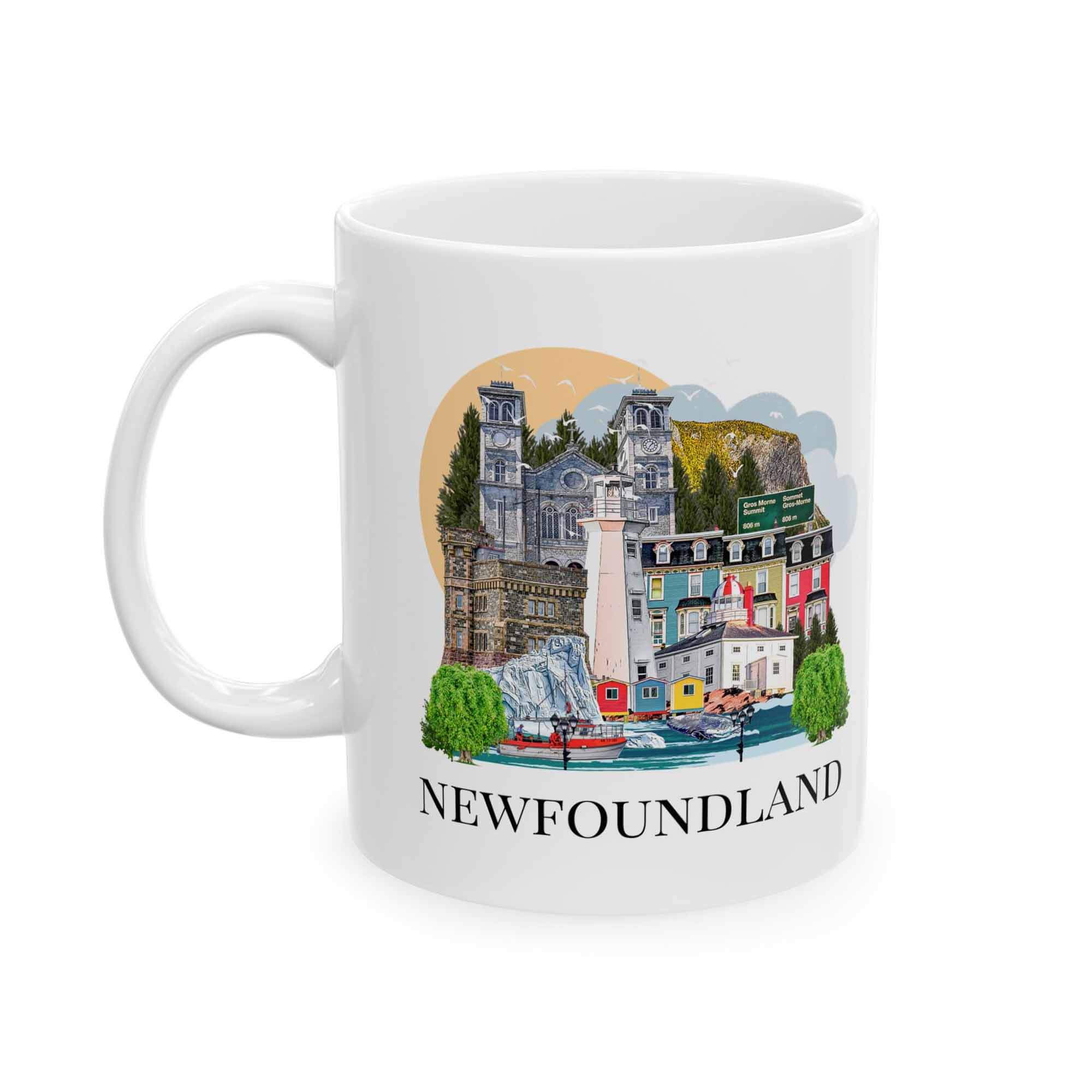 This Newfoundland Landmark Mug brings together the province’s most recognizable coastal icons — the colourful row houses of St. John’s, the Church in the heart of the city, Cape Spear Lighthouse (both old and new), Signal Hill, drifting icebergs, whales offshore, fishing boats, and rugged mountain backdrops.