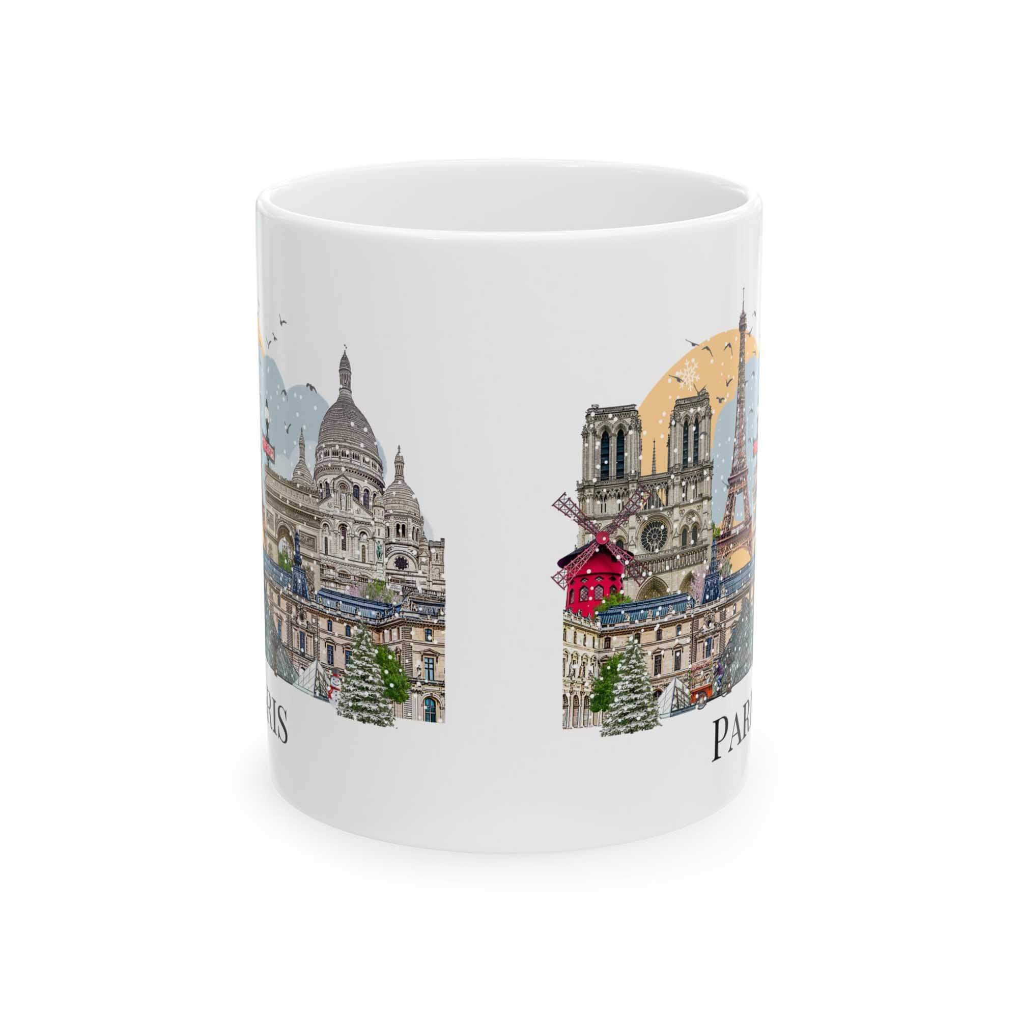 This Paris Christmas Mug features the city’s most beloved landmarks — the Eiffel Tower, Louvre pyramids, Sacré-Cœur, Notre Dame, the Arc de Triomphe, and a pop of red from the Moulin Rouge windmill— reimagined with Christmas details that bring warmth to the scene.