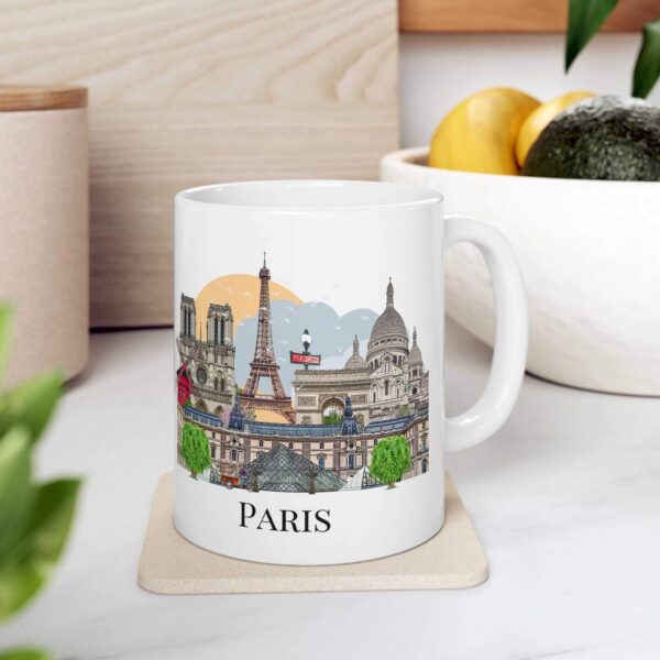 This Paris Landmark Mug brings together some of the city’s most recognizable sights — the Eiffel Tower rising above the skyline, the glass pyramids of the Louvre, the hilltop beauty of Sacré-Cœur, the historic Notre Dame Cathedral, and the iconic Arc de Triomphe.