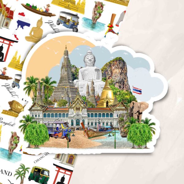 This Thailand travel sticker reflects the island’s temples, and tropical atmosphere that captures the beauty that makes Thailand a special destination.