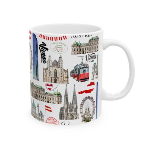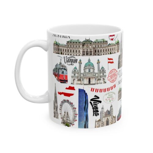This Vienna pattern mug features a vibrant wrap-around design showcasing beloved Viennese architecture and cultural icons. Perfect for your morning coffee, tea, or hot chocolate, these mugs bring a little bit of Austria into every cozy moment. Add this charming Vienna mug to your collection or gift it to someone who dreams of wandering Vienna’s cobbled streets!